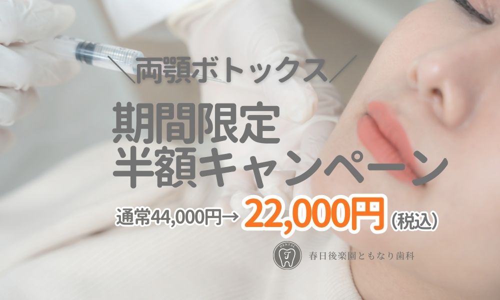 春日後楽園ともなり歯科では、両顎ボトックスの期間限定キャンペーンを行っております。